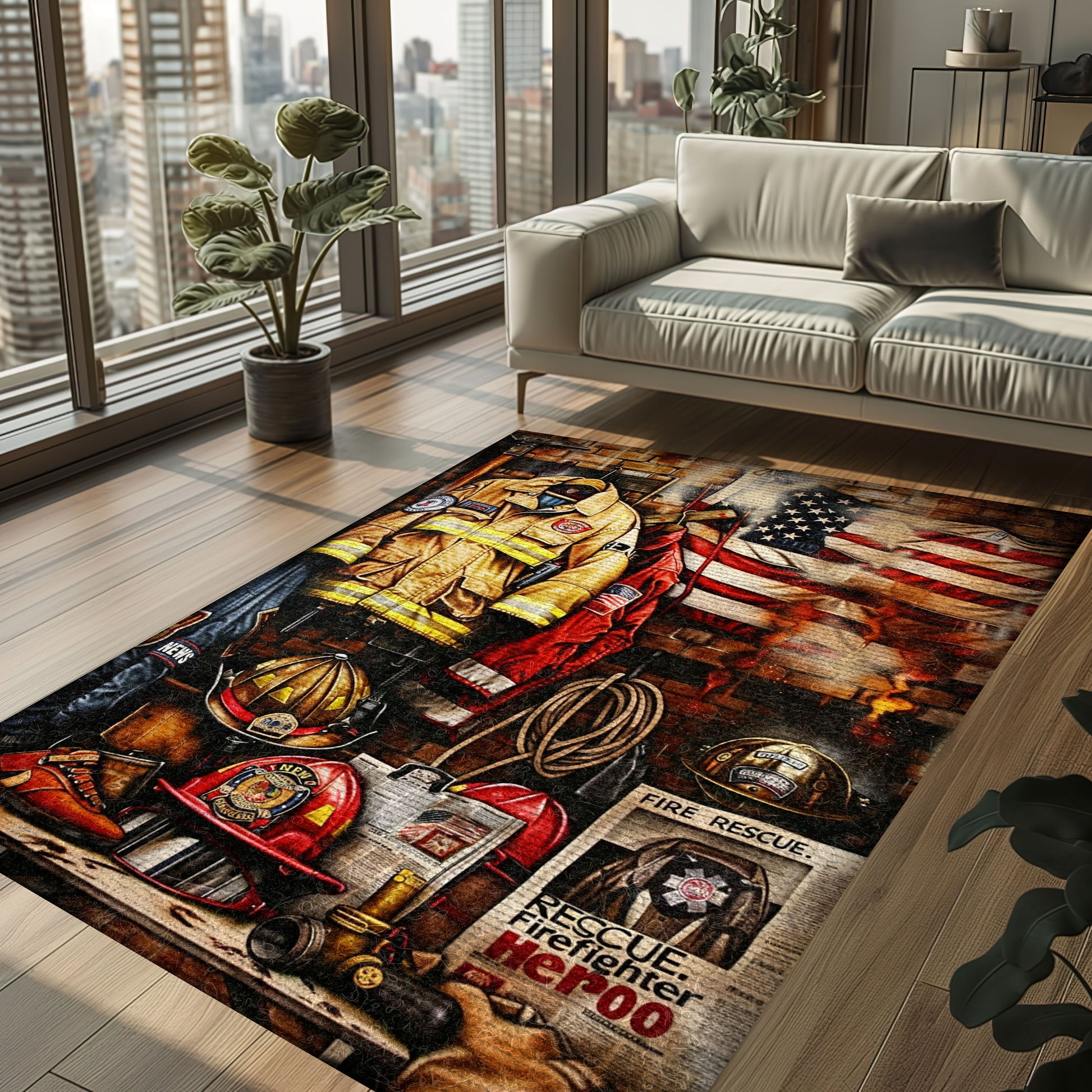 Bold Design Choice: Custom Firefighter's Gear and Memorabilia Area Rug, Firefighter Rugs for Living Room Bedroom, Firefighter Rectangular Rugs Full Size FR131