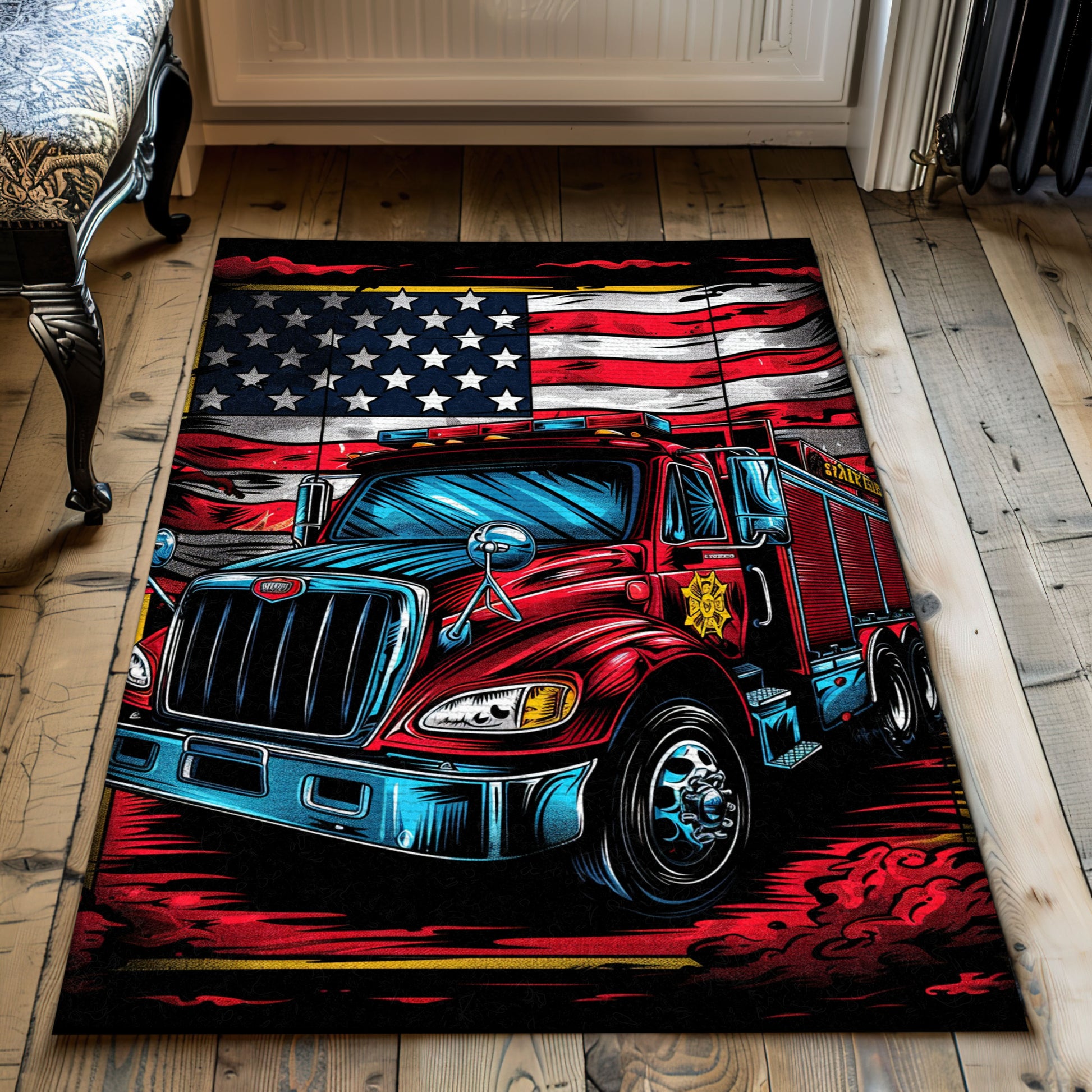 Bold Fire Truck in Front of the USA Flag Area Rug: Show Support for First Responders and Nation, Firefighter Rugs for Living Room Bedroom, Firefighter Rectangular Rugs Full Size FR60