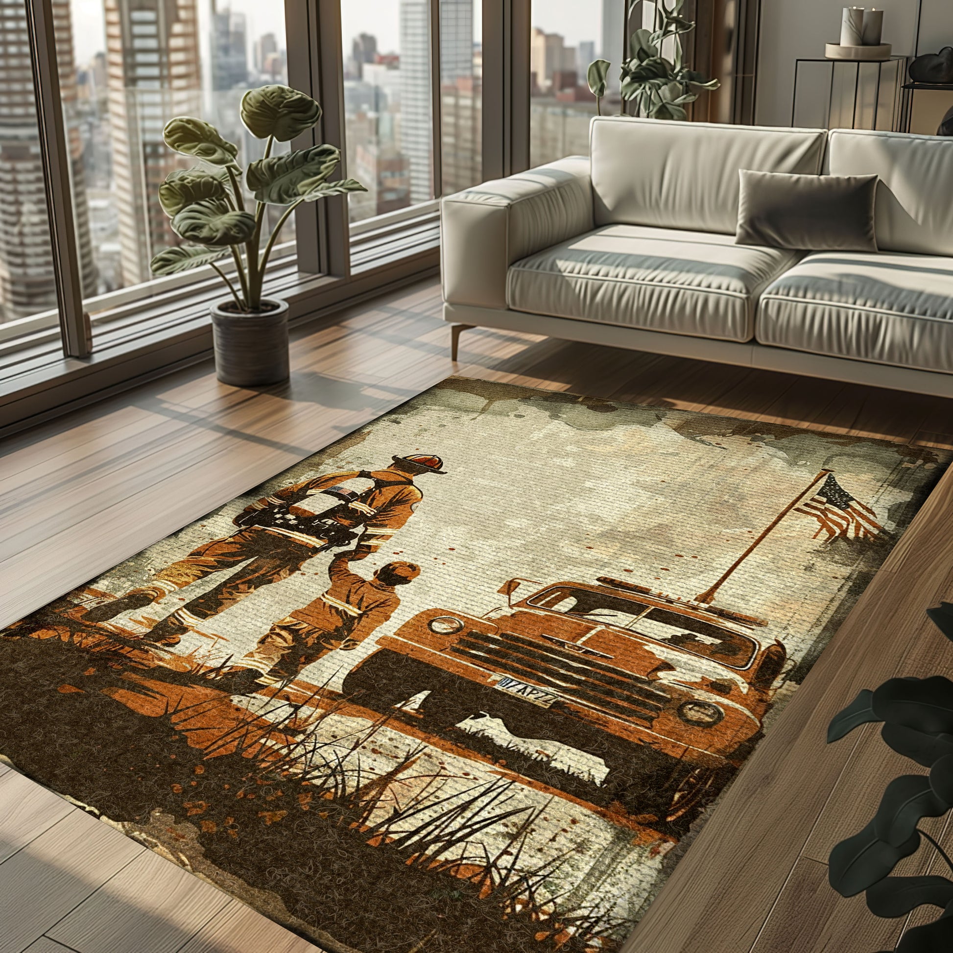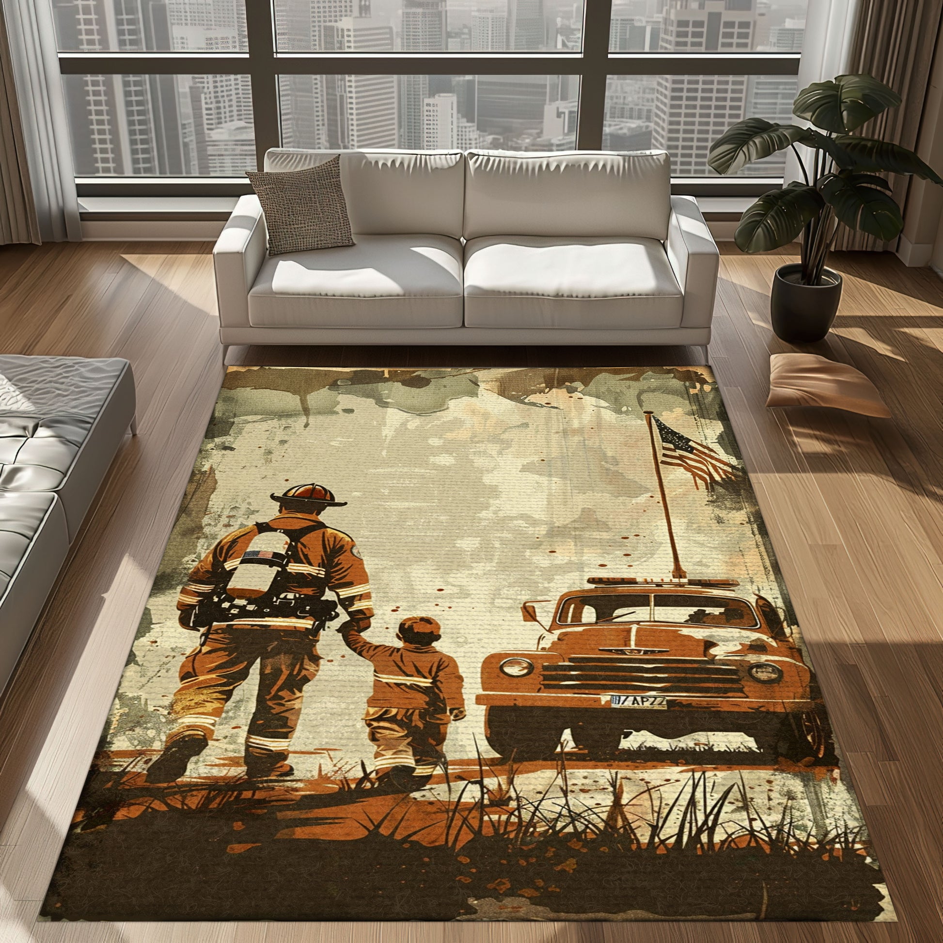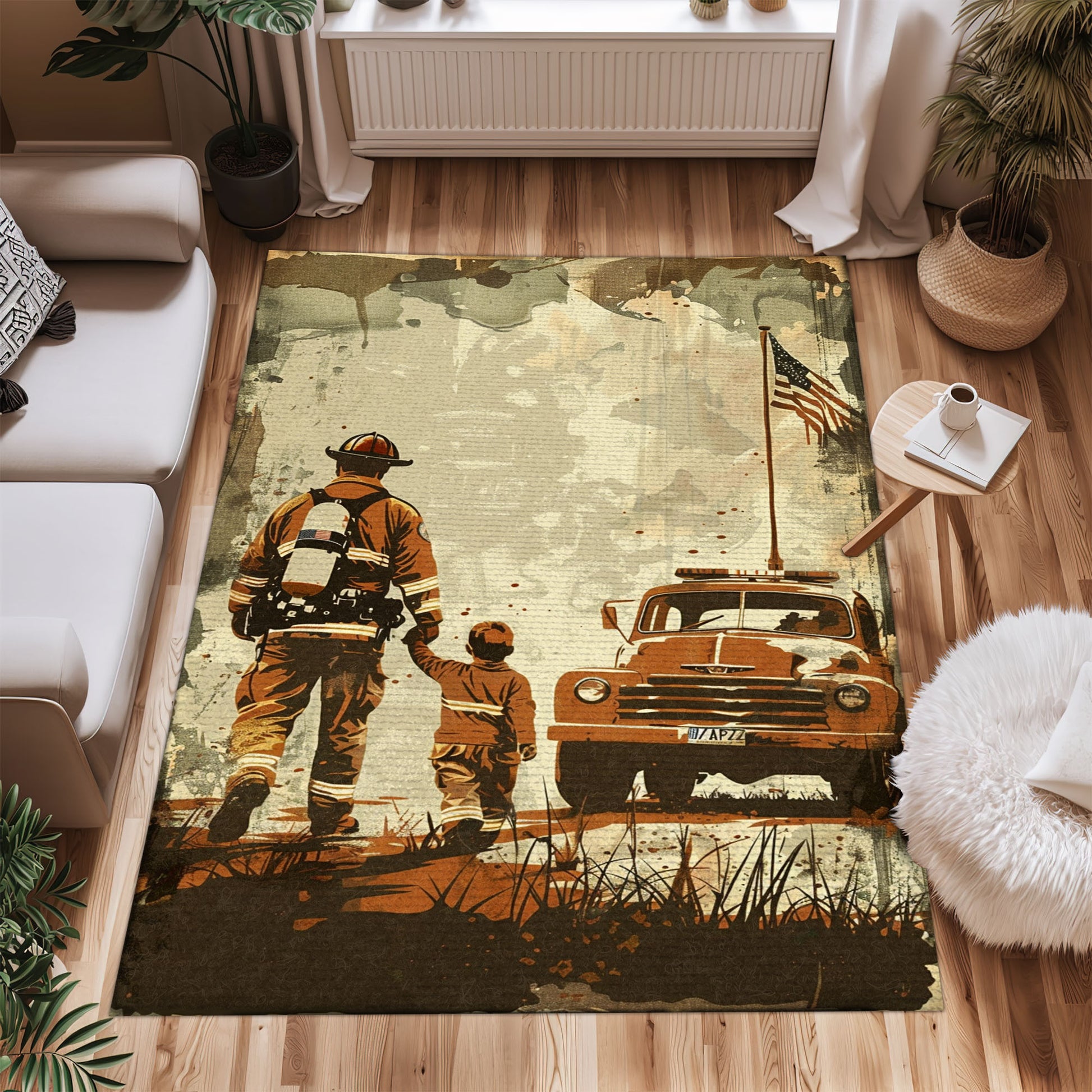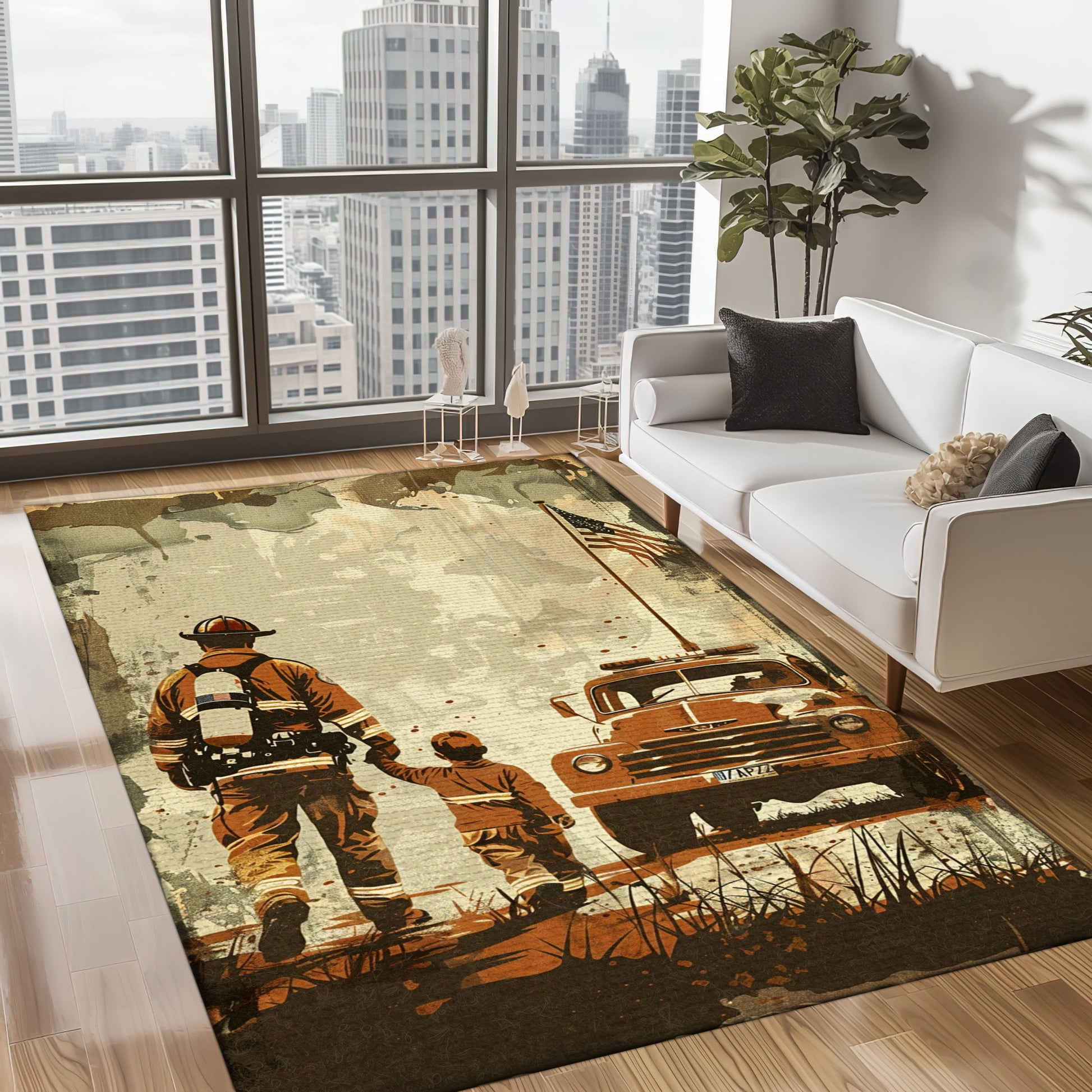 Bold Firefighter Dad and Son Theme Personalized Rug: Pay Tribute to Generations of Bravery, Firefighter Rugs for Living Room Bedroom, Firefighter Rectangular Rugs Full Size FR67