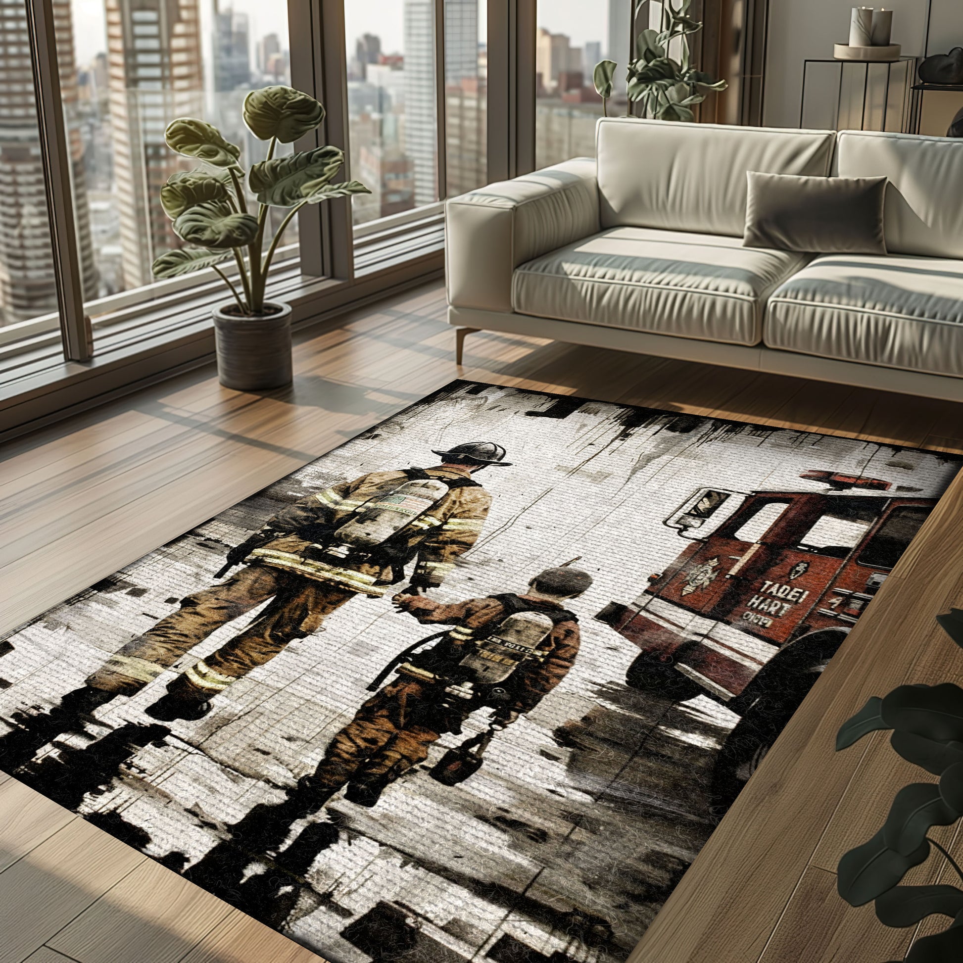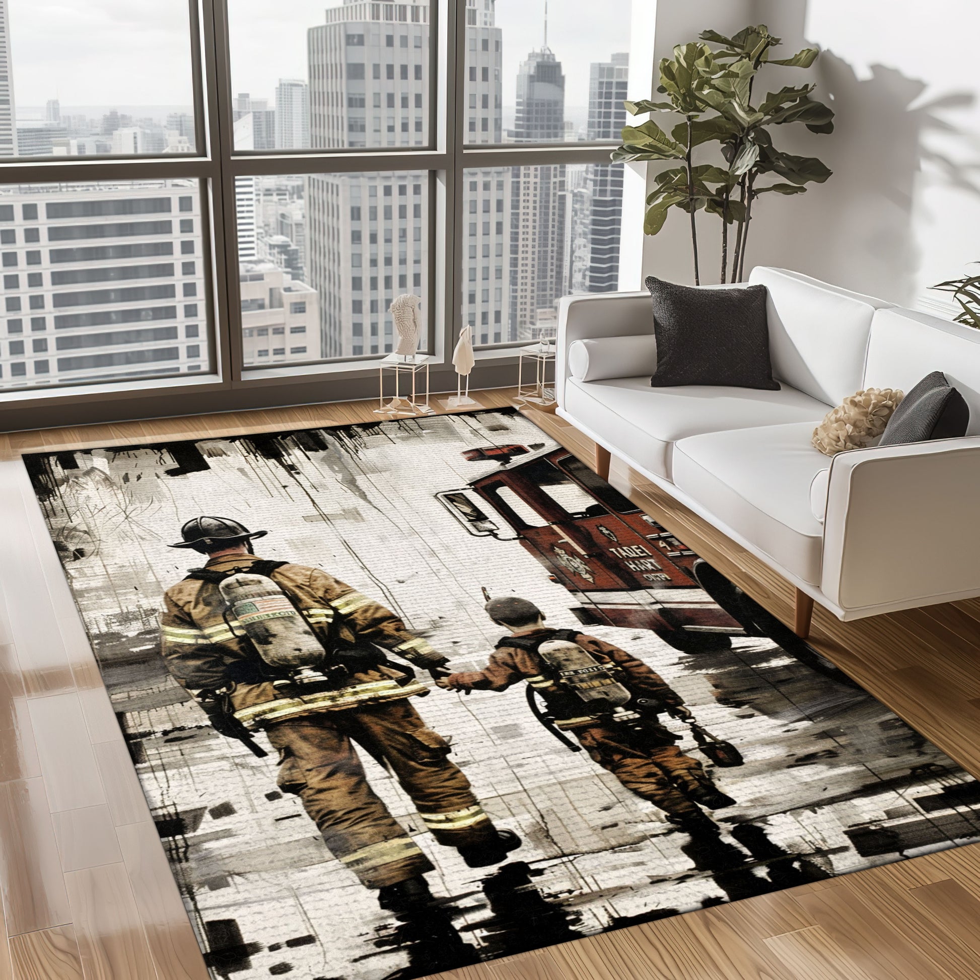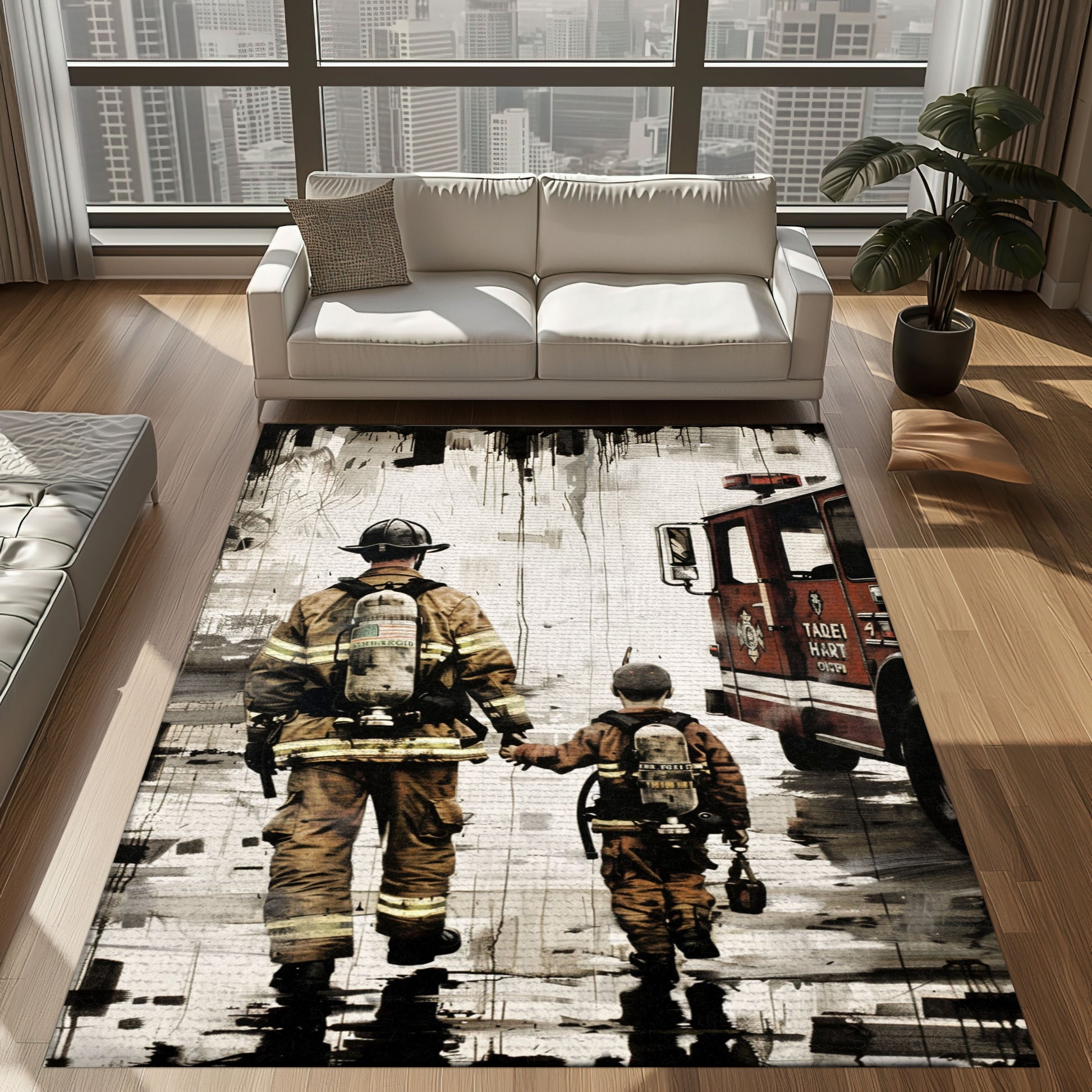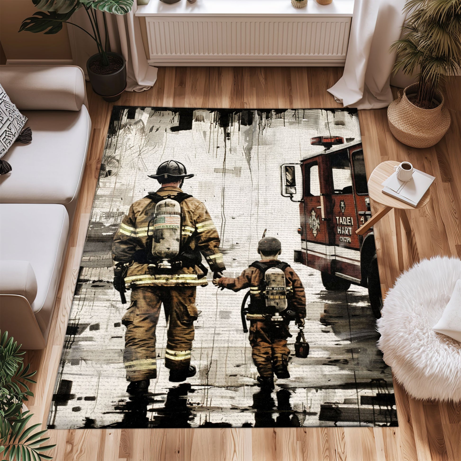 Courageous Dad Firefighter and Son Custom Rectangular Rug: Honor Generations of Bravery, Firefighter Rugs for Living Room Bedroom, Firefighter Rectangular Rugs Full Size FR77