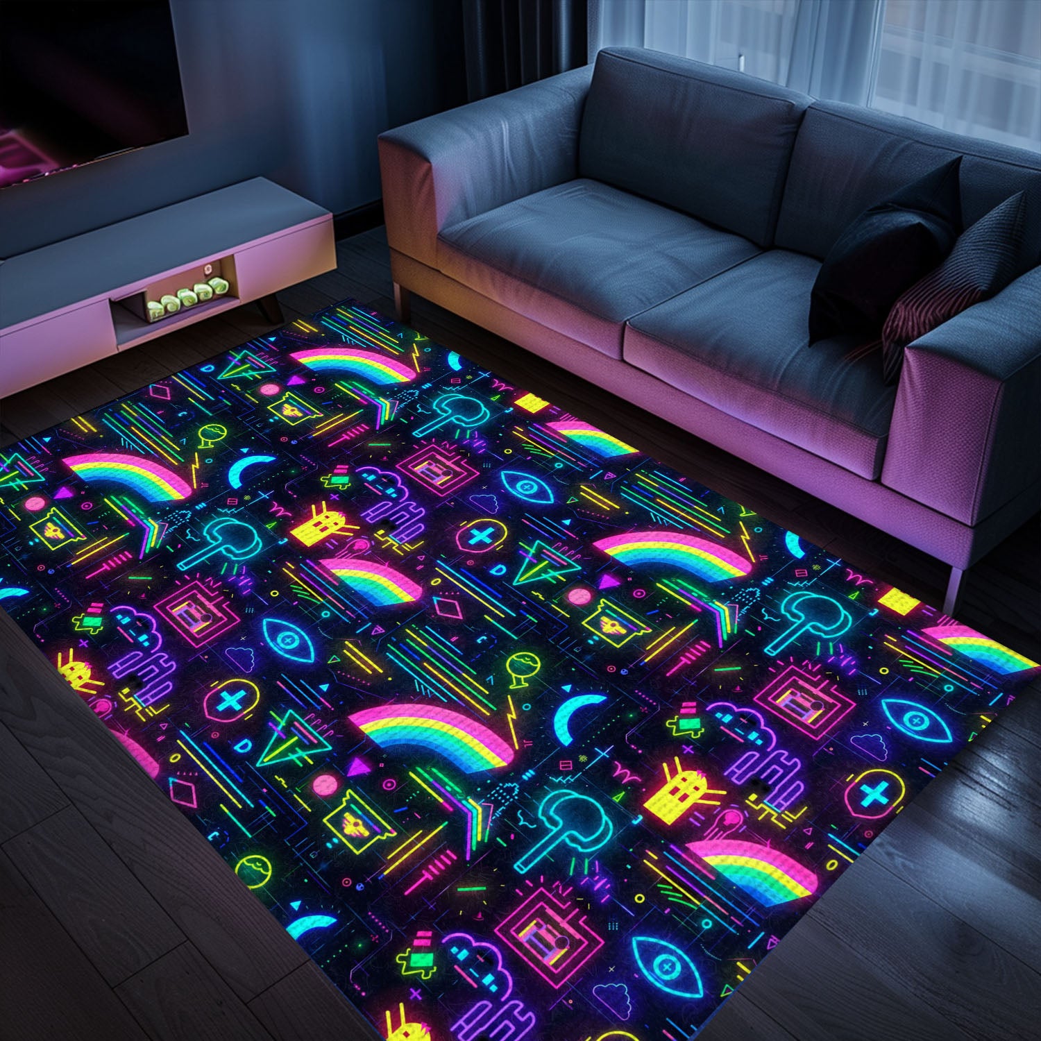 Dark and Neon 80s Arcade NES Game 8bit Area Rug: Perfect for Creating Gaming Zones in Your Home, Arcade Decor, Gift for Gamers, Video Game Lovers G320