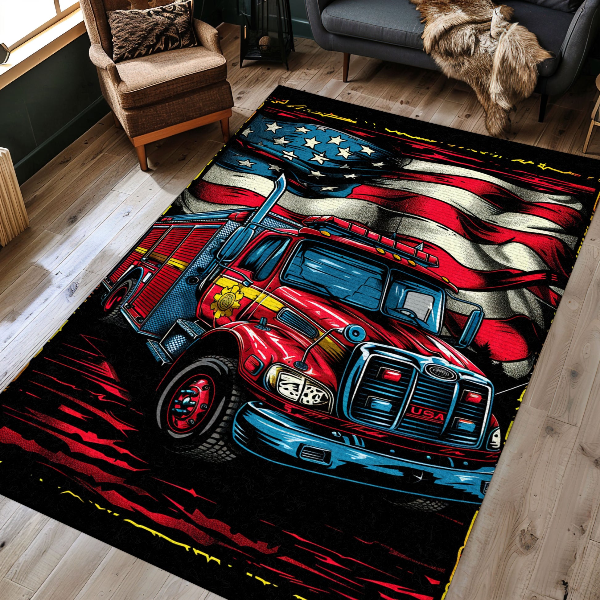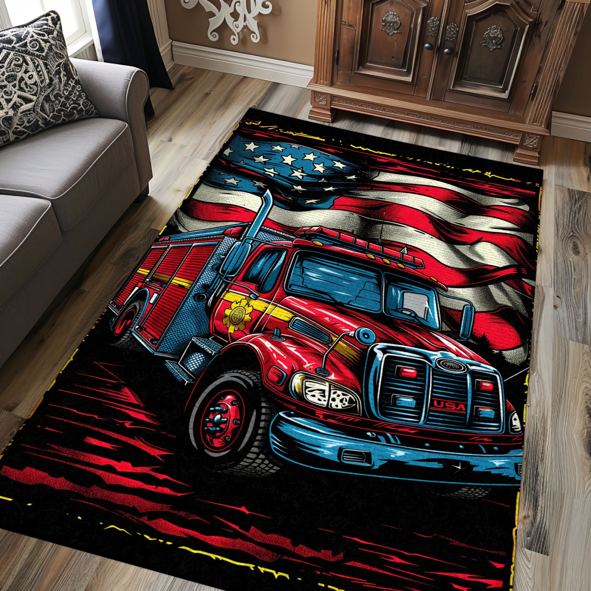 Dynamic Fire Truck in Front of the USA Flag Custom Carpet: Honor Firefighters and Country, Firefighter Rugs for Living Room Bedroom, Firefighter Rectangular Rugs Full Size FR57
