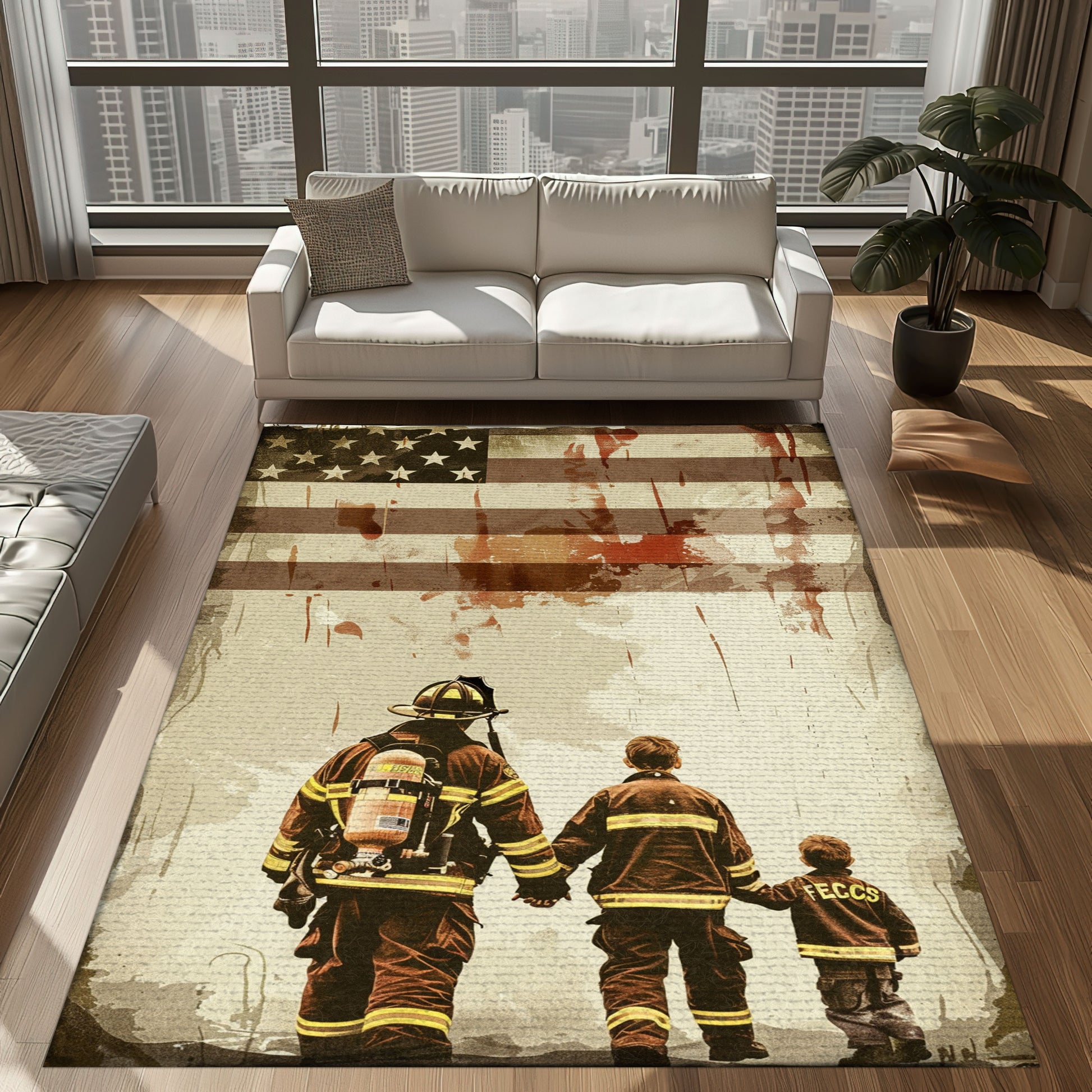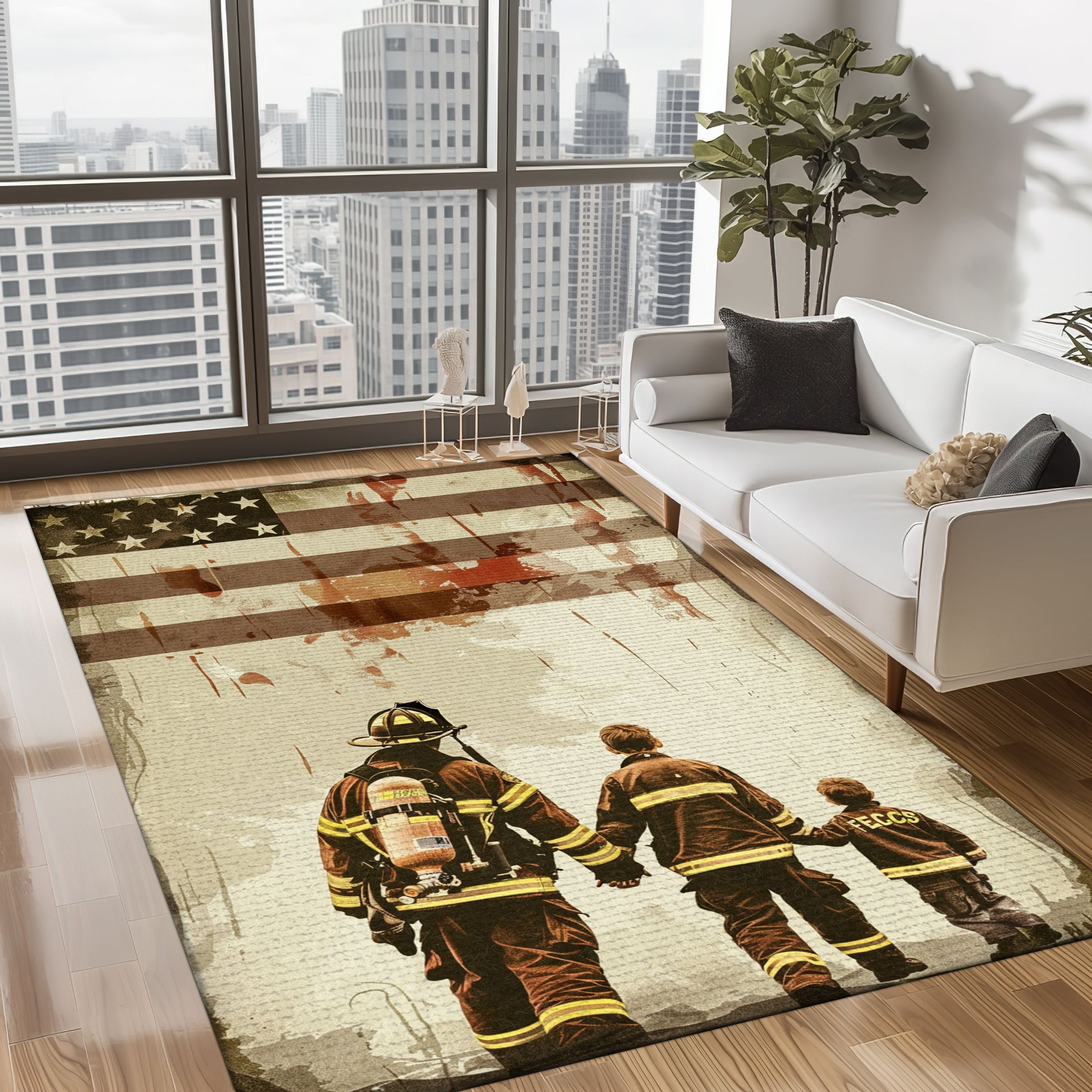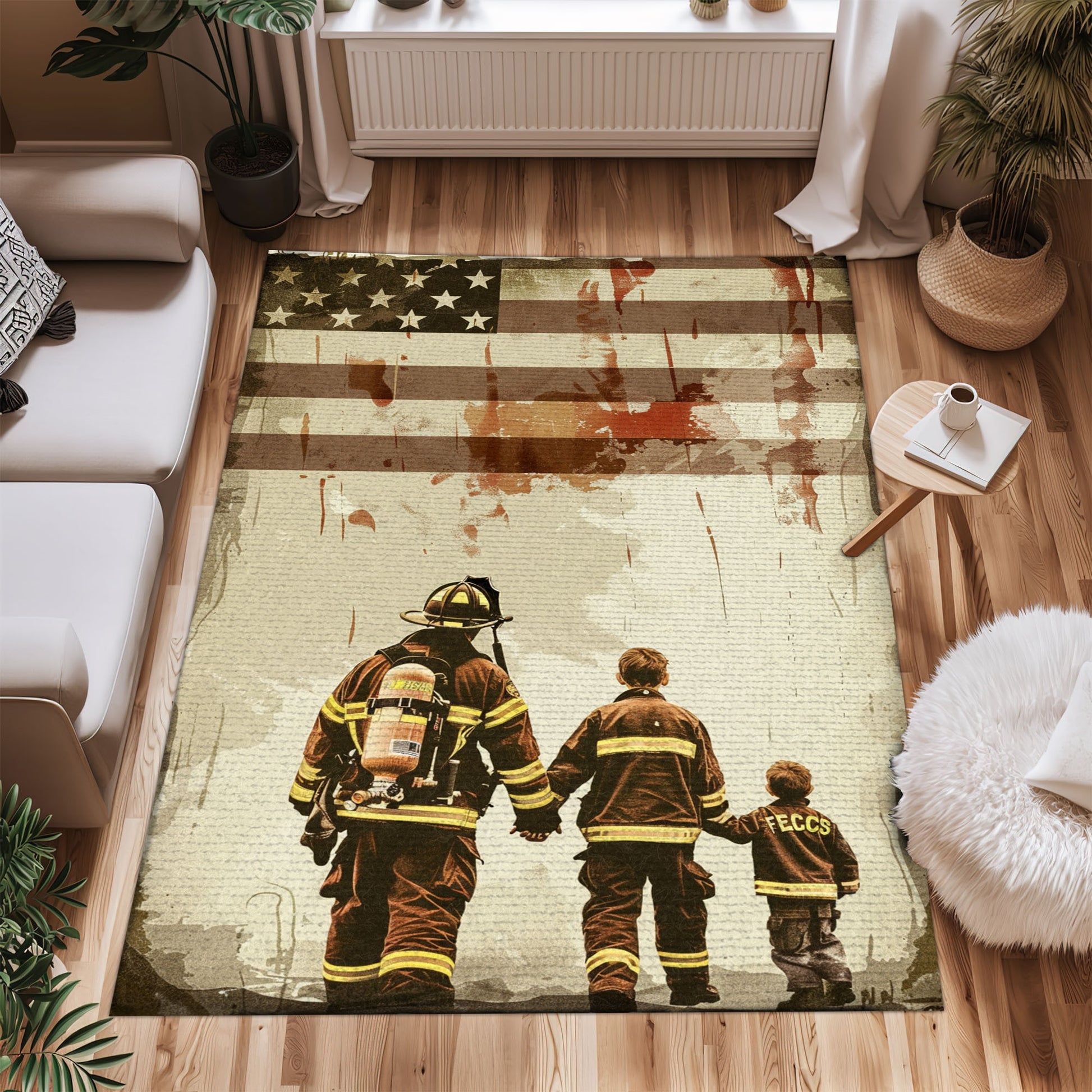 Heartwarming Dad Firefighter and Son Theme Personalized Rug: Pay Tribute to Family and Service, Firefighter Rugs for Living Room Bedroom, Firefighter Rectangular Rugs Full Size FR79