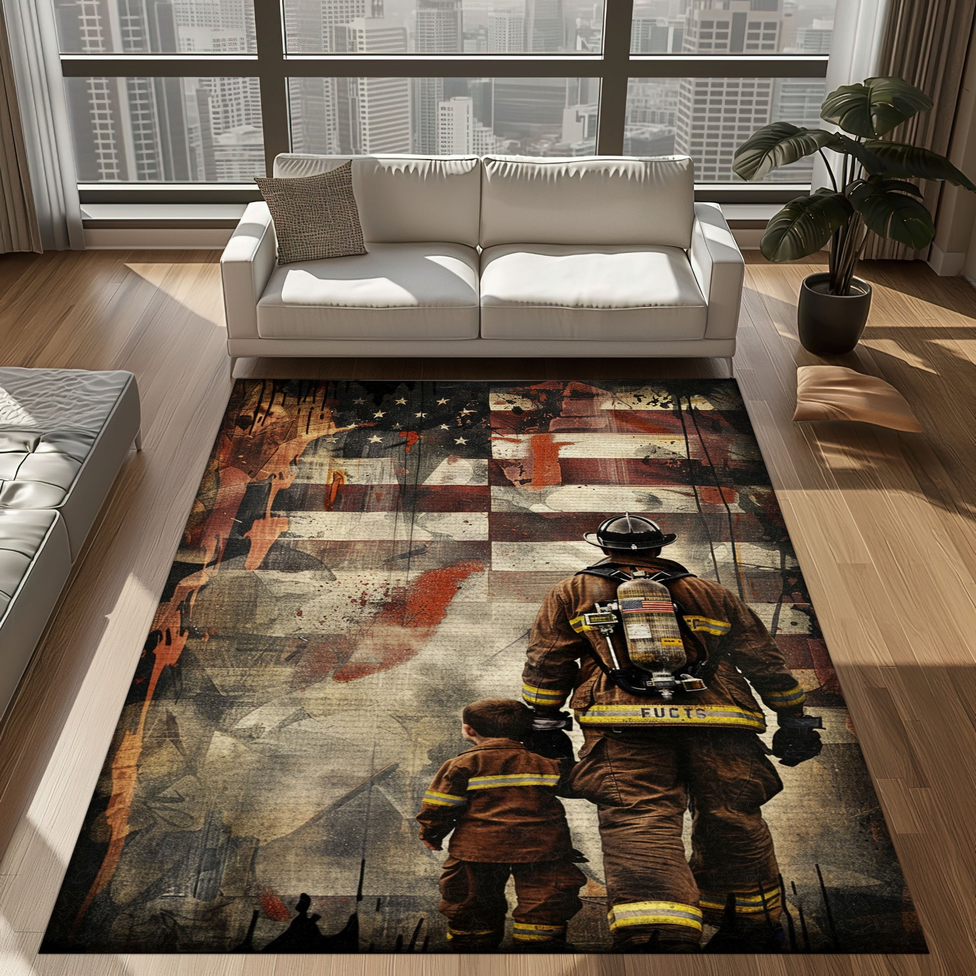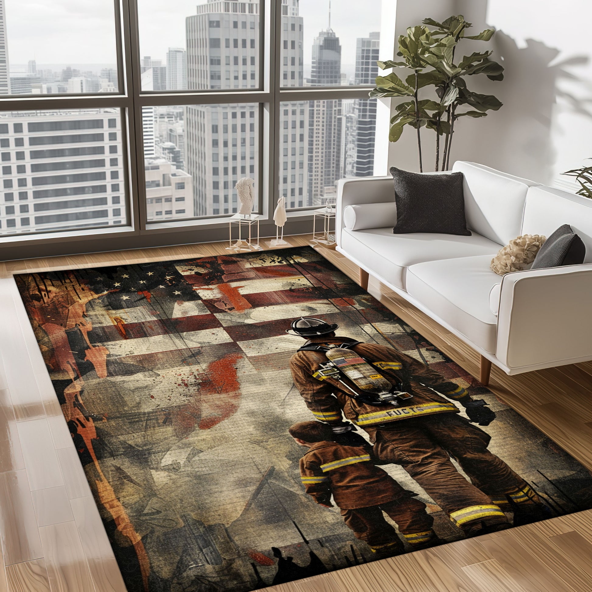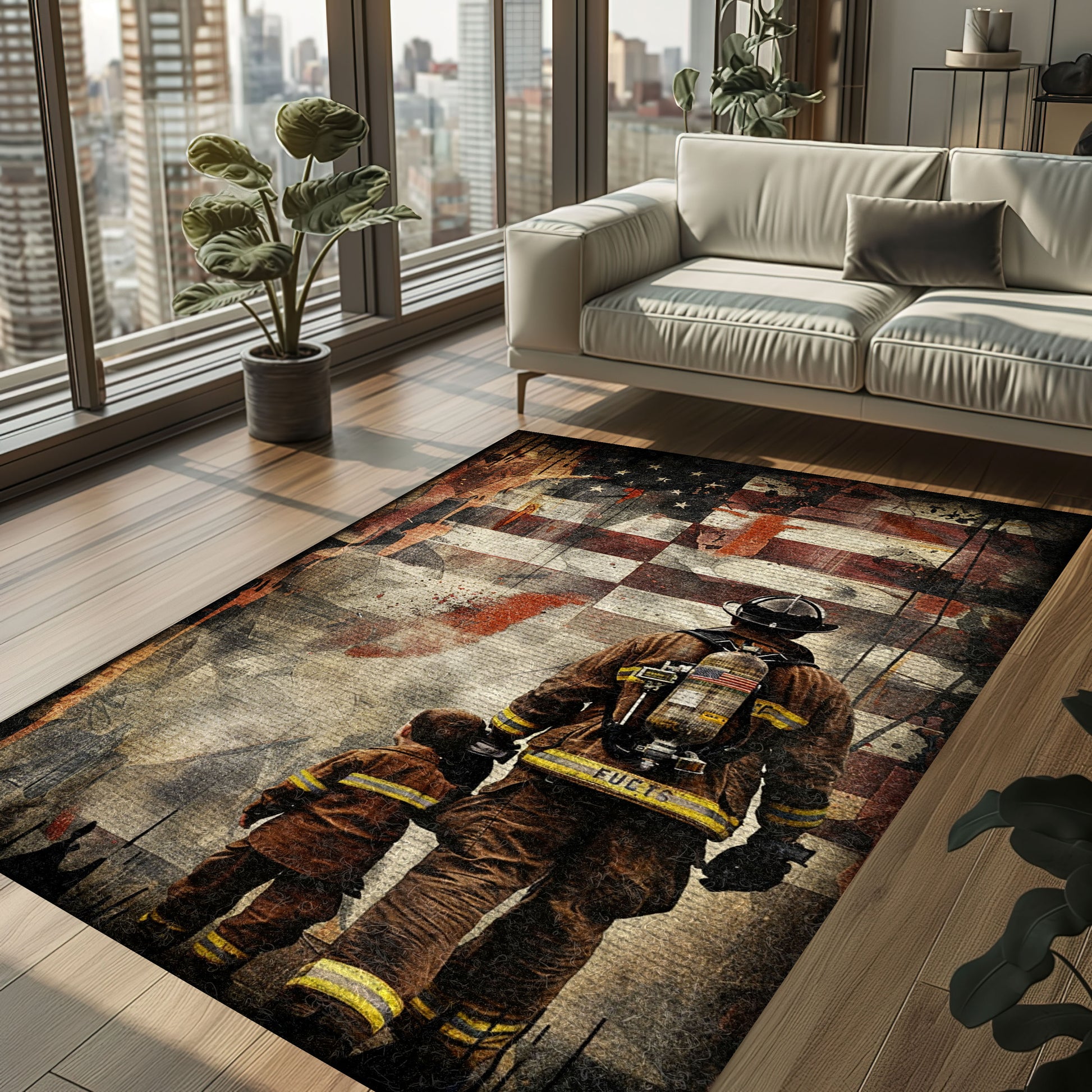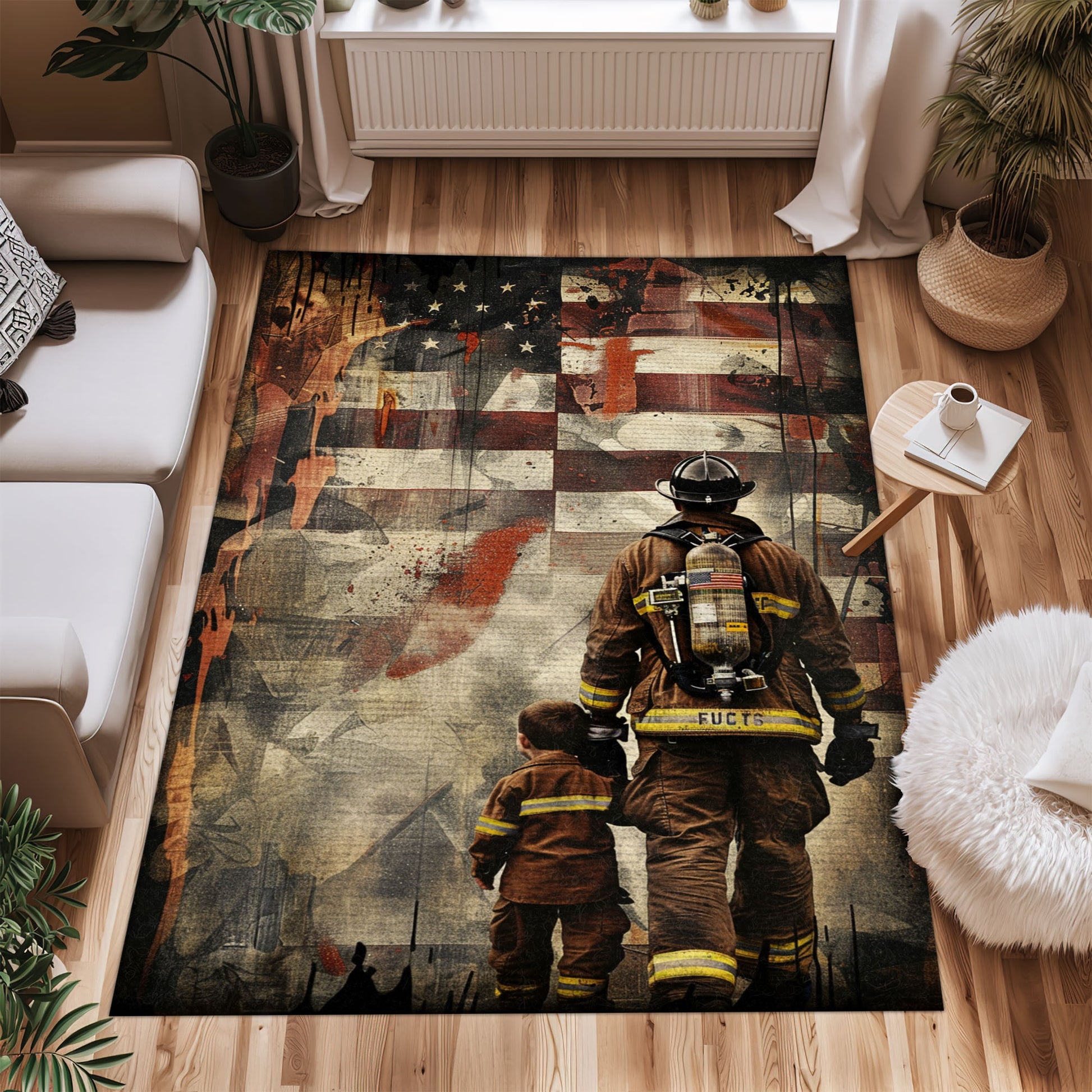 Heroic Bond: Dad Fire Fighter and Son Firefighter Personalized Area Carpets, Firefighter Rugs for Living Room Bedroom, Firefighter Rectangular Rugs Full Size FR90