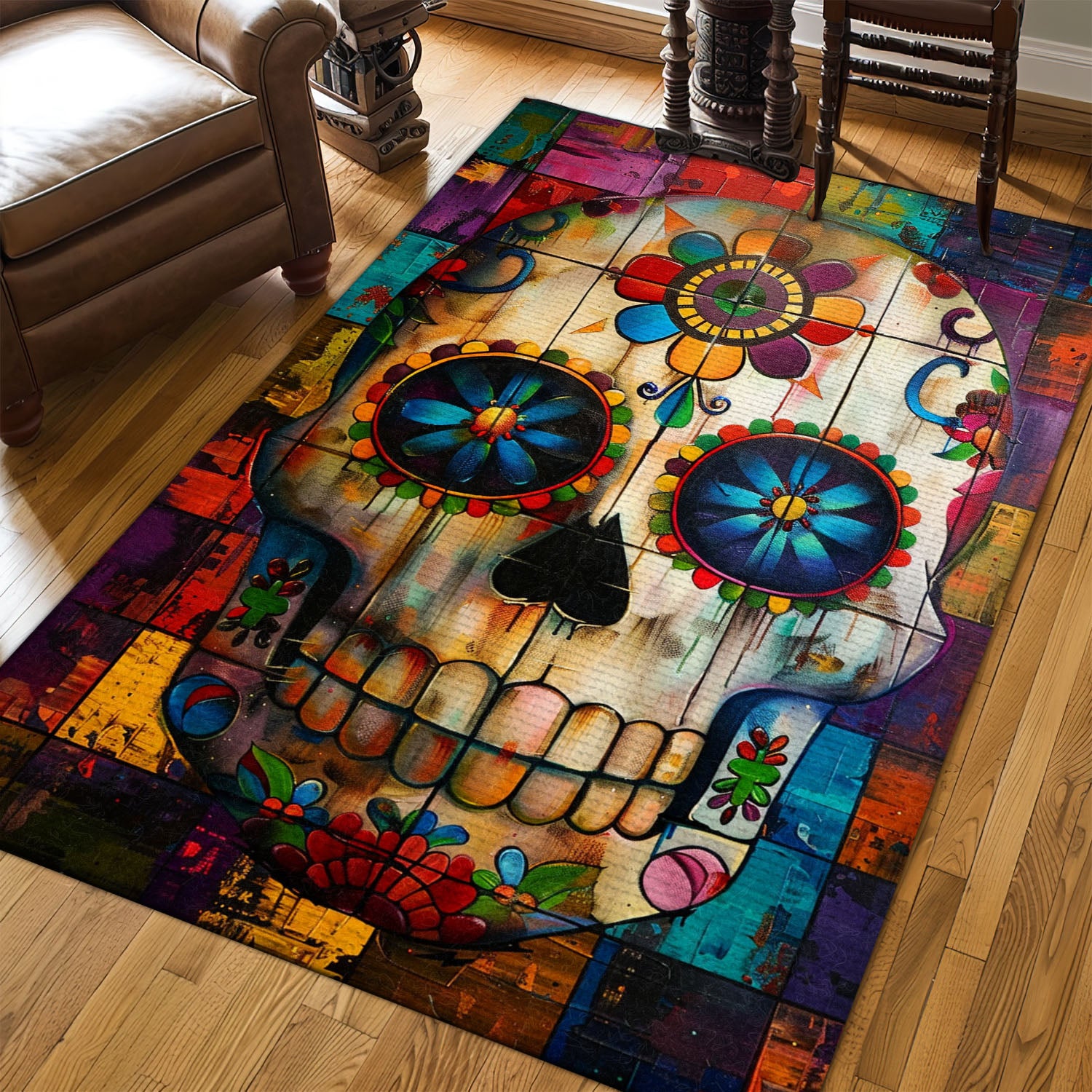 Make Your Floors Pop with Color: Skull and Floral Print Area Rug, Skull Rug, Area Rugs 5x8, 4x6, 3x5 Size for Living Room Bedroom Home Decorative Skull K38