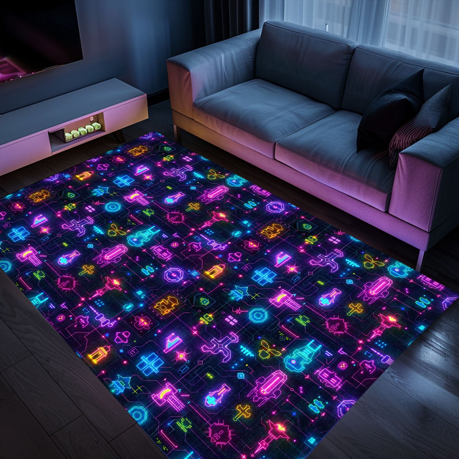 Step Into the World of Classic Gaming with Dark and Neon 80s Arcade NES Game 8bit Rugs, Arcade Decor, Gift for Gamers, Video Game Lovers G289