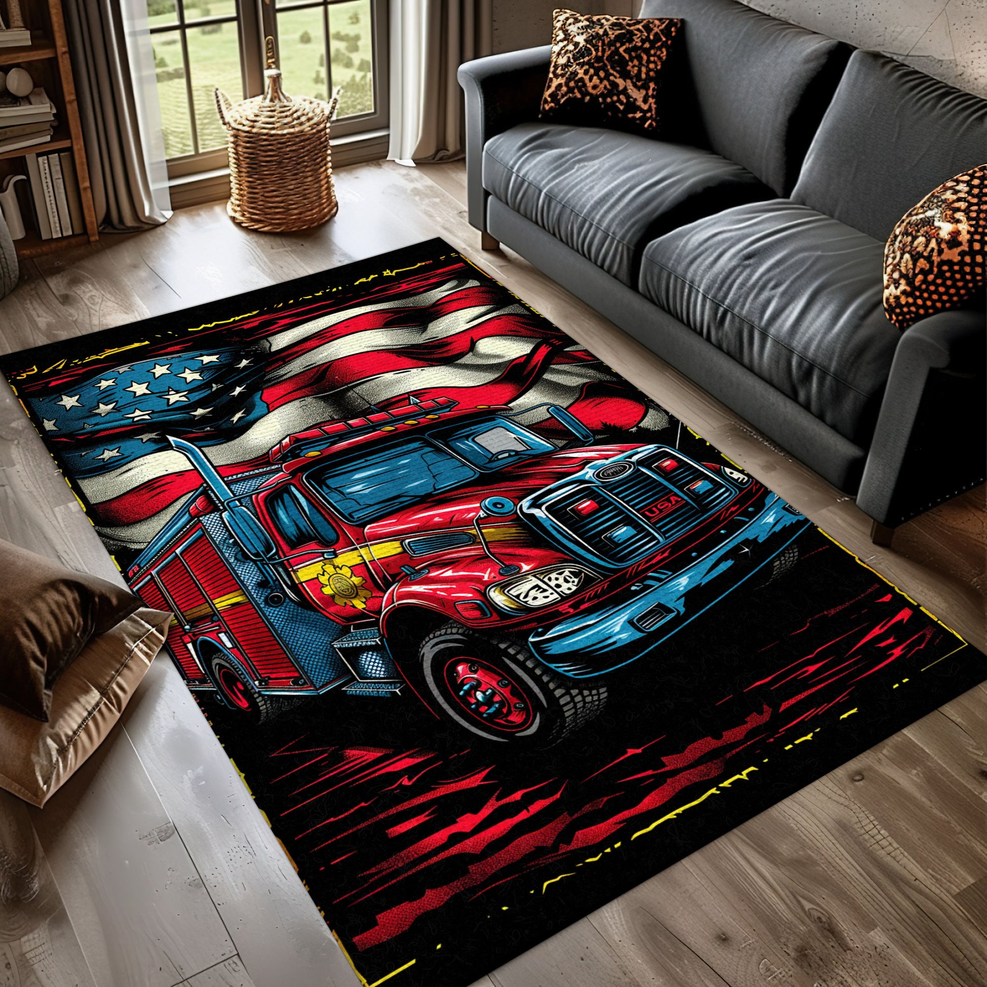 Dynamic Fire Truck in Front of the USA Flag Custom Carpet: Honor Firefighters and Country, Firefighter Rugs for Living Room Bedroom, Firefighter Rectangular Rugs Full Size FR57