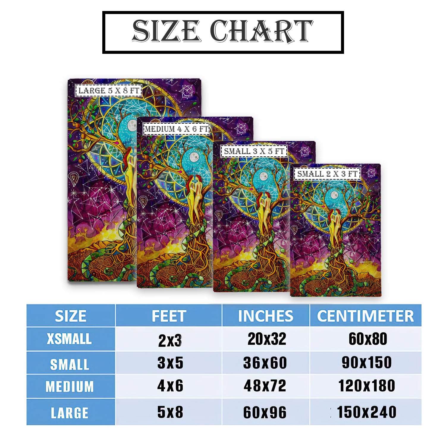 Small | 1.7' x 2.7' | 20 x 32 | 52 x 82 |